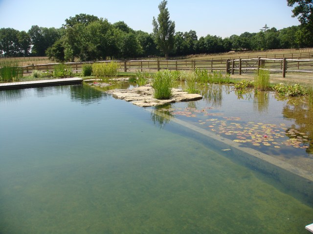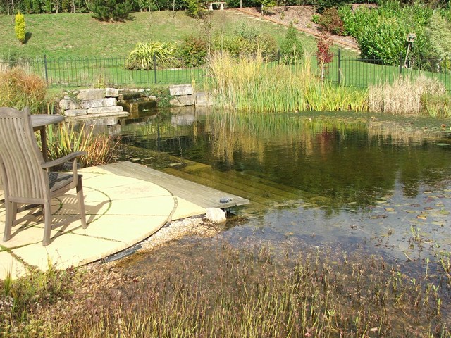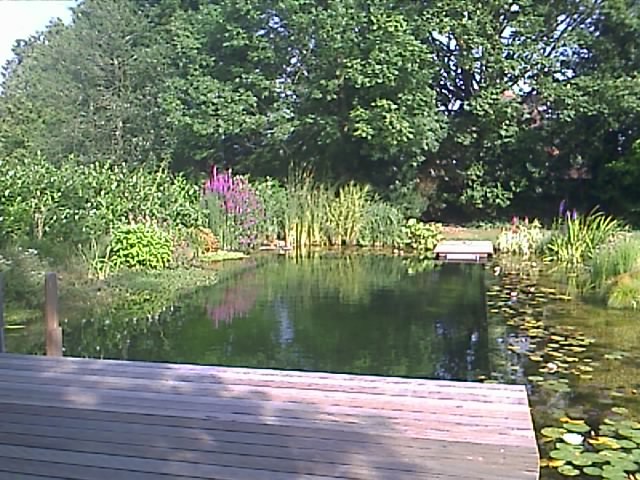 Design notes: This is a conversion from a swimming pool to a swimming pond. The original pool was built by the previous owner of the house, but unfortunately it always leaked – even on its open evening!! The current owner was not happy and asked us to come up with a green alternative. The original concrete shape closely resembled a heart and we used one side for the swimming area and the other for the regeneration area. Once lined, the leakage problem was resolved and with the addition of some decking, filtration and filtration plants, it has been converted into a beautiful looking swimming pond.