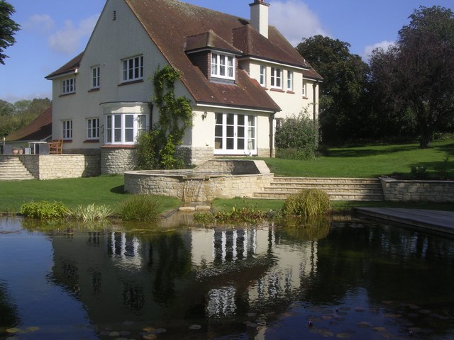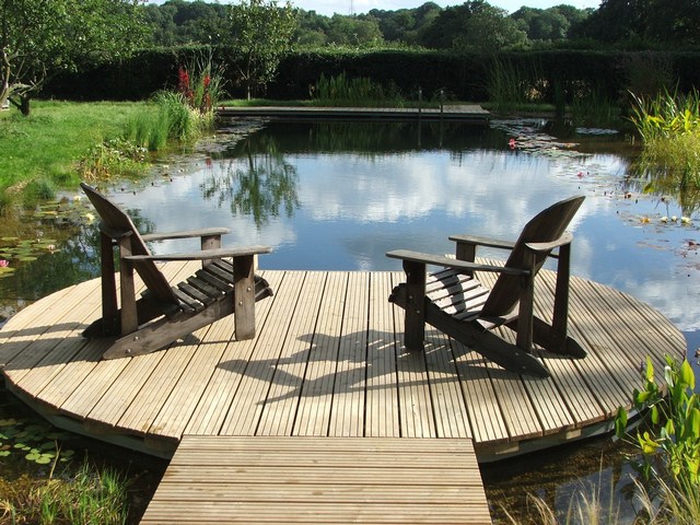 Design notes: This pond was designed by Michael Littlewood. We carried out the excavation, lining, filtration and planting. The client had his own input as he had some large rocks which he wanted to utilise as stepping stones and a diving platform and this arrangement was his own design. Sitting on the deck, one has a spectacular view over three counties, Wiltshire, Dorset and Hampshire.