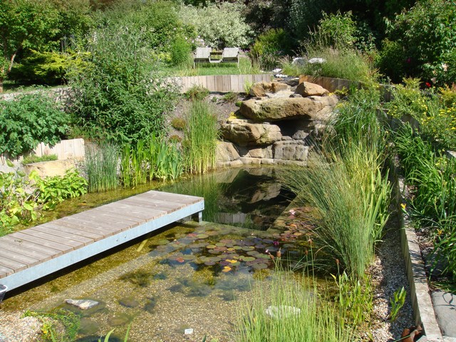 Design notes: The old school had already been converted into a house and only had a relatively small front garden which sloped down to the road. Our designers built walls and beds to “level” the site and the swimming pond covered most of the garden leaving a small area for some lawn. The design incorporated a deck and gazebo leaving enough room to enjoy a swim.